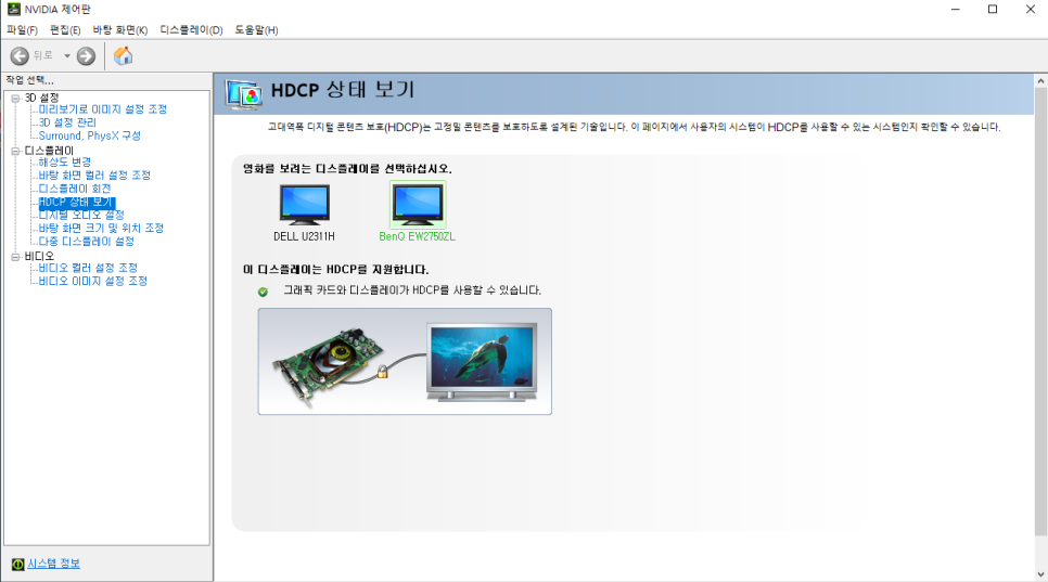 Nvidia 제어판 HDCP 상태 확인 제가 보유하고 있는 노트북과 연결된 두 개의 외부 디스플레이 (모니터) 입니다.