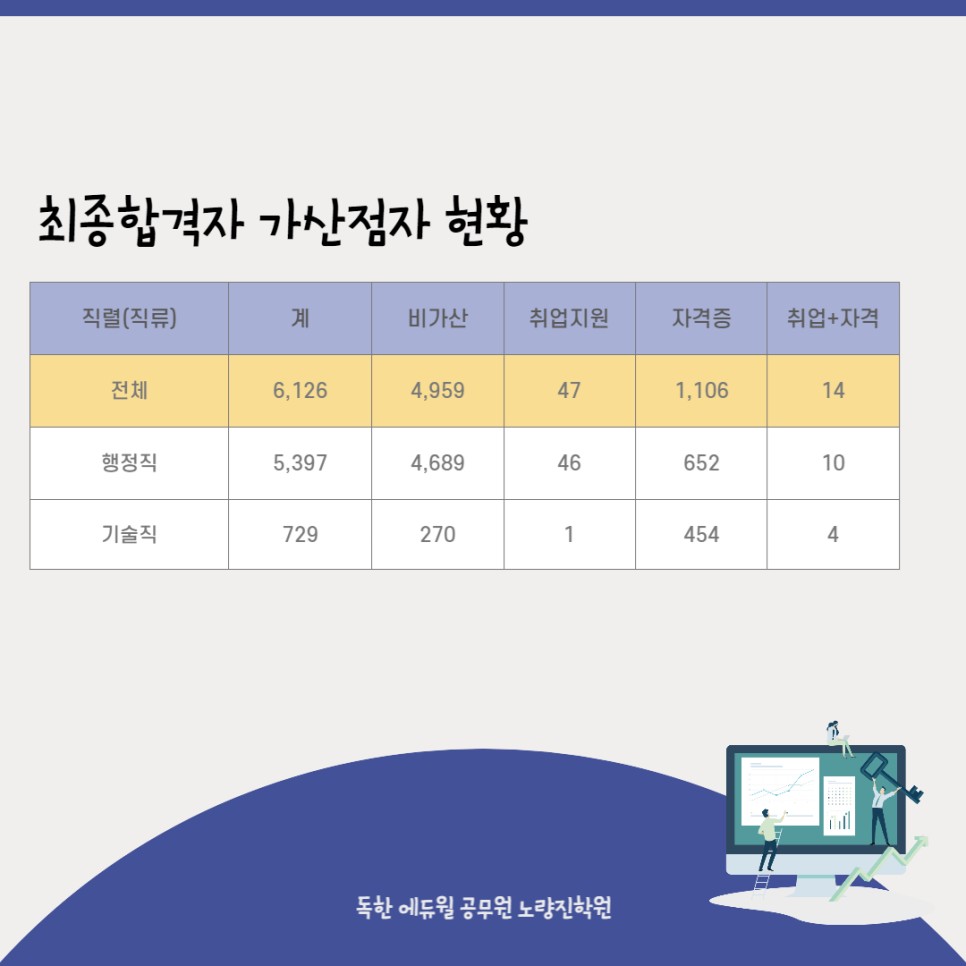최종 합격자 중 자격증을 취득해 필기시험에서 가산점을 받은 인원은 행정직 708명, 기술직 459명이며 비율로 보면 행정직 13%, 기술직 63%입니다.