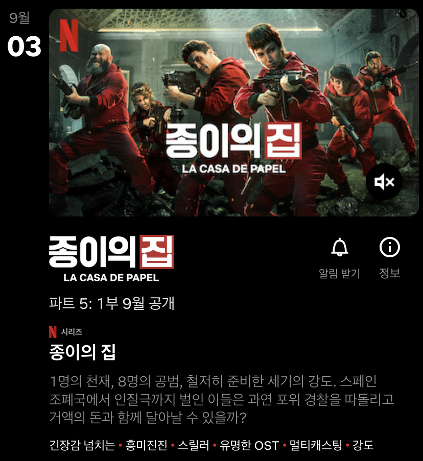 종이의집 파트 51부 9월 3일 공개지의 집 인기가 높아서 상단에 나와있나보네