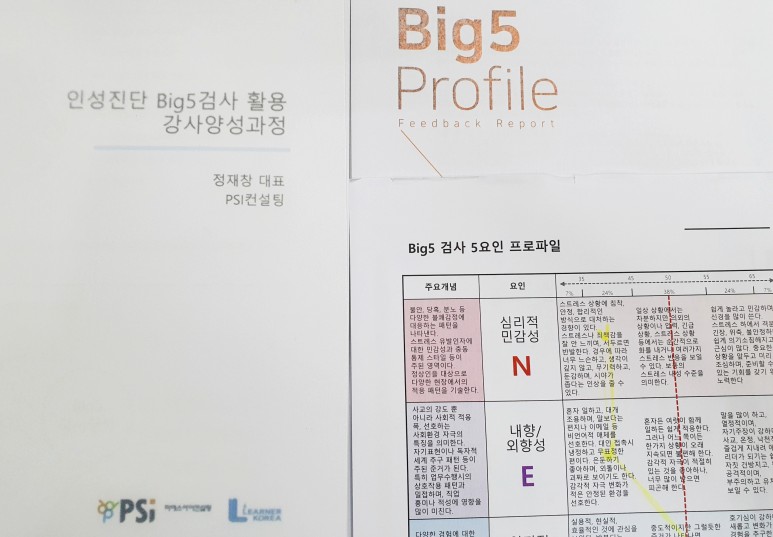 흥미로웠던 BIG 5과정 강사 자격증을 땄다! 교육은 러너코리아에서 받았으며 강사는 PSI 컨설팅 정재창 박사였다. 이후 과정이 NEG BIG 5 과정으로 개편돼 더 이상 정 교수가 운영하지 않는 것 같았다. 하루 동안의 교육으로 성격이나 행동유형 검사에 대해 좀 더 공부하고 싶다면 해당 과정을 적극 권장한다.