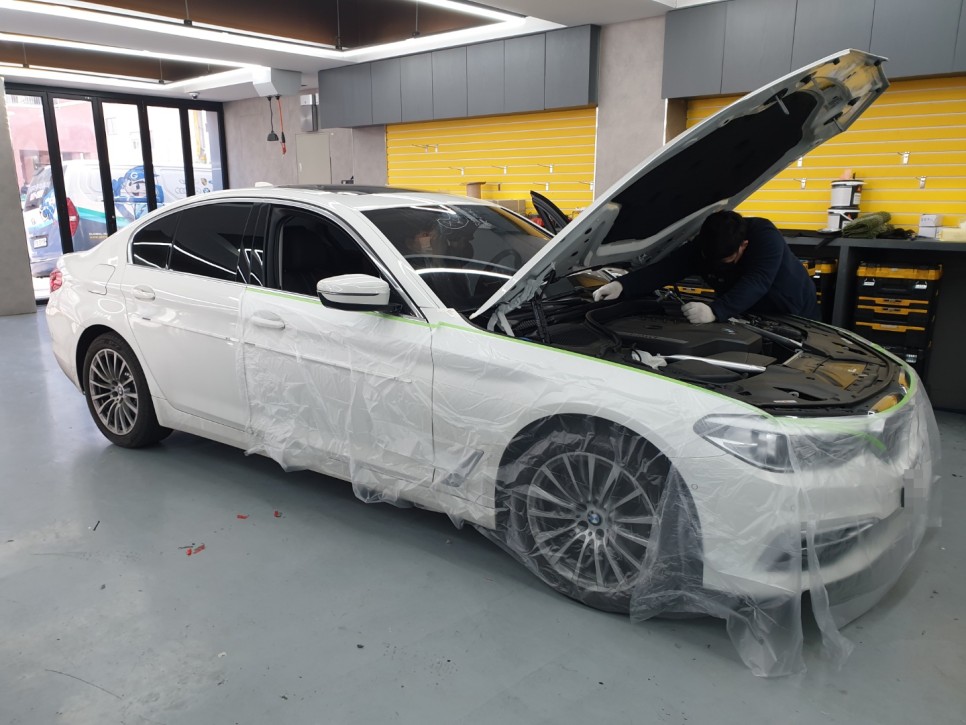 성남 한국자동차 백합에서는 공식 센터에서 사용하는 순정부자재와 같은 순정만을 사용하여 시공합니다.BMW G30 자동차유리부착(2인1조)