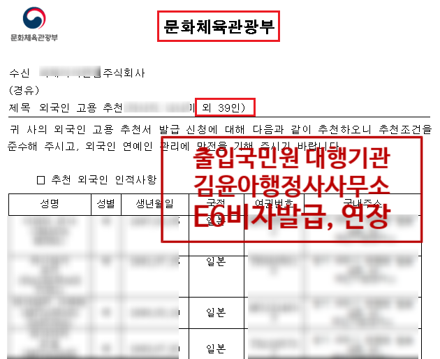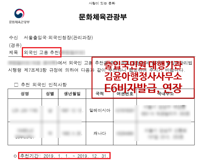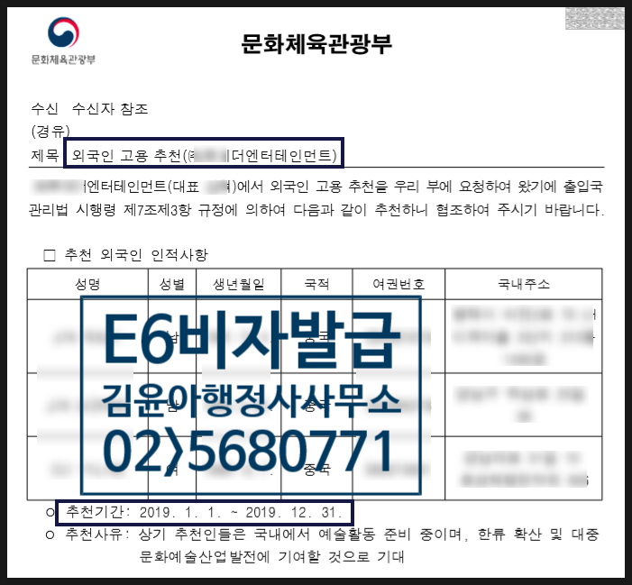 이렇게 E6 비자를 발급받기 전에 문화체육관광부로부터 추천서를 발급받고 싶다면 연예기획사와 외국인과의 전속계약서를 작성해야 하며, 회사에서는 사업자 관련 서류와 대중문화예술기획업 등록증, 회사소개서 및 대표자 이력서, 그리고 향후 활동계획서 등을 상세하게 준비해야 합니다.국민공감행정사사무소의 실제 비자발급 사례또, 외국인의 경우도 여권이나 연예 관련 프로필이나 과거 실적과 같은 서류를 준비하게 됩니다.국민공감행정사사무소의 실제 비자발급 사례E6 비자를 발급받고자 하는 경우 과거 연예활동, 즉 한국에서 활동을 하고자 하는 관련성이 있는 과거 활동경력을 준비하는 것이 중요하지만 연습생으로 들어오는 경우에도 연습생으로서의 경력이나 프로필을 준비하는 것도 중요합니다.문화체육관광부추천서사례(국민공감행정사사무소)물론 이미 해외에서 활동하고 있는 연예인의 경우에는 이를 뒷받침할 서류를 준비하면 되지만 그에 못지않게 향후 활동 계획을 준비하는 것도 중요합니다.문화체육관광부추천서사례(국민공감행정사사무소)최근 오디션 프로그램이나 외국인이 한국에 데뷔하는 경우가 많아 E6 비자를 발급받는 사례가 많이 늘고 있습니다.여러분의 방문을 환영합니다.행정심판, 음주운전구제, 영업정지구제, 행정사, 행정사사무실 www. 국민공감.com이에 E6 비자 발급을 원할 경우 회사 서류와 외국인이 준비해야 하는 서류를 문화체육관광부와 출입국관리사무소 기준에 적합하도록 준비하는 것이 중요합니다.따라서 한국에 입국하여 연예활동을 하고자 하는 외국인비자(E6비자)를 발급받고자 하는 경우에는 출입국전문행정사와 상의하여 진행하는 것이 좋습니다.따라서 한국에 입국하여 연예활동을 하고자 하는 외국인비자(E6비자)를 발급받고자 하는 경우에는 출입국전문행정사와 상의하여 진행하는 것이 좋습니다.따라서 한국에 입국하여 연예활동을 하고자 하는 외국인비자(E6비자)를 발급받고자 하는 경우에는 출입국전문행정사와 상의하여 진행하는 것이 좋습니다.따라서 한국에 입국하여 연예활동을 하고자 하는 외국인비자(E6비자)를 발급받고자 하는 경우에는 출입국전문행정사와 상의하여 진행하는 것이 좋습니다.