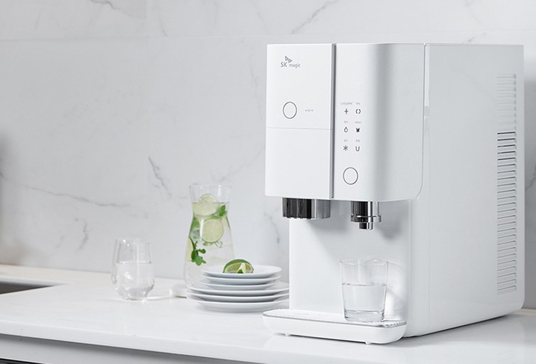 토출구가 양쪽에 있는데 한쪽은 물이 나오고 다른 한쪽은 얼음이 나옵니다.빙량도 고제품보다 용량이 올라 하루 평균 500~600개 정도 얼음이 나온다고 하니 이 정도면 가정에서 충분히 쓰겠죠?실제로 지금 사용한 지 한 달? 정도 됐는데 얼음이 부족했던 적은 없었어요.한여름에도 그랬으니까, 뭐… 얼음 용량은 충분하대.살균 기능도 굉장히 잘 되어 있습니다.아이스룸에서 코크까지 직접 UV 안심 케어를 할 수 있는 것이 SK 얼음 냉온 정수기입니다.코크는 기본적으로 2시간마다 UV 파장을 이용하여 자동 살균이 가능합니다.얼음을 보관하는 아이스룸도 하루에 두 번씩 자동 살균되도록 설정되어 있습니다.그래서 더욱 깨끗하고 위생적으로 얼음까지 즐길 수 있습니다.세균은 물론 노로바이러스까지 99.999% 차단된다고 하니까 이것만 하면 안심하고 쓸 수 있겠죠?