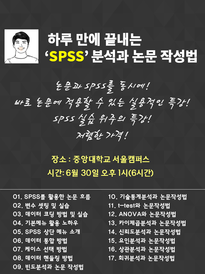 그리고 SPSS 사용법을 하루만에 끝내는 것도 반드시 가능합니다. 아까 말씀드렸듯이 분석 전 처리와 본인 연구에서 필요한 분석 방법만 실습해보면 응용은 인터넷 정보로도 충분히 가능하기 때문입니다!~