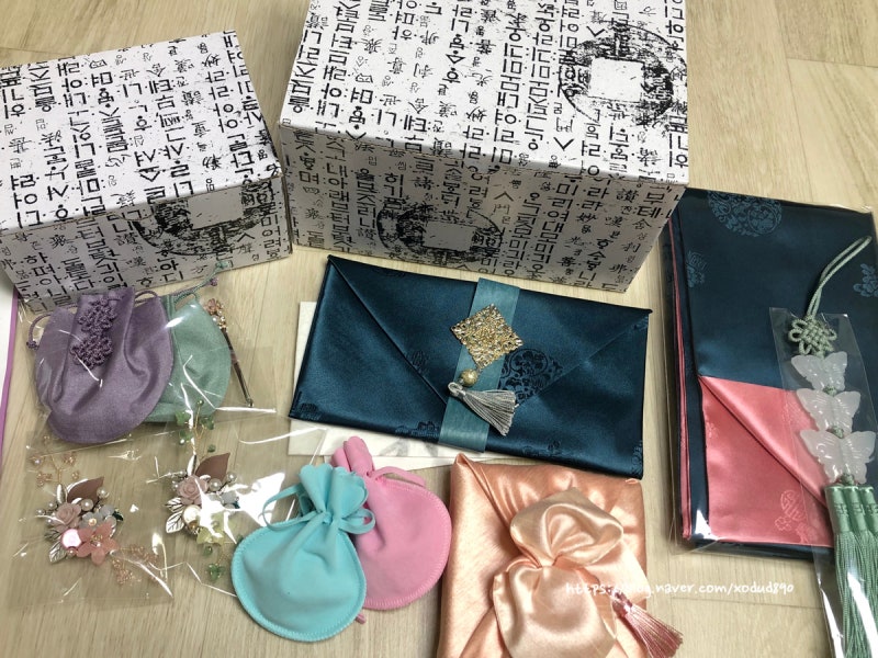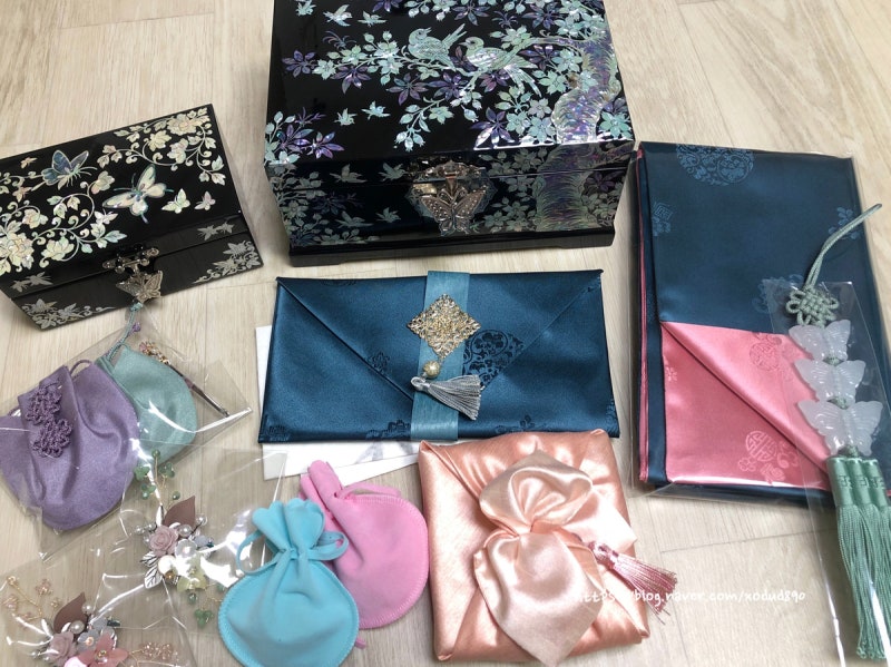 그리고 추가로 구입할 수 있는 예단봉투별로 현금예단함을 사려고 2단 자개상자를 구입하면 따로 드려도 된다고 해서 예단봉투만 구입한 용보자기 컬러와 같은 것을 골랐는데 역시 예쁜지 서식지는 기본인지 인쇄대필로 되어 있는 것을 고르면 되는데 저는 예쁘게 인쇄대필로 신청했습니다.신랑 신부의 부모님 성함, 금액, 날짜를 입력하면 서식지에 인쇄되어 있습니다.완전 예뻐요.